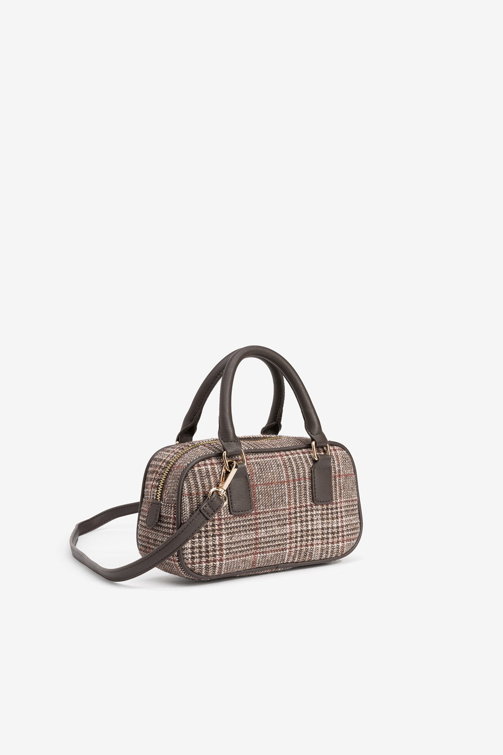 Bolso bowling de diseño a cuadros con asas marrones y cierre dorado.