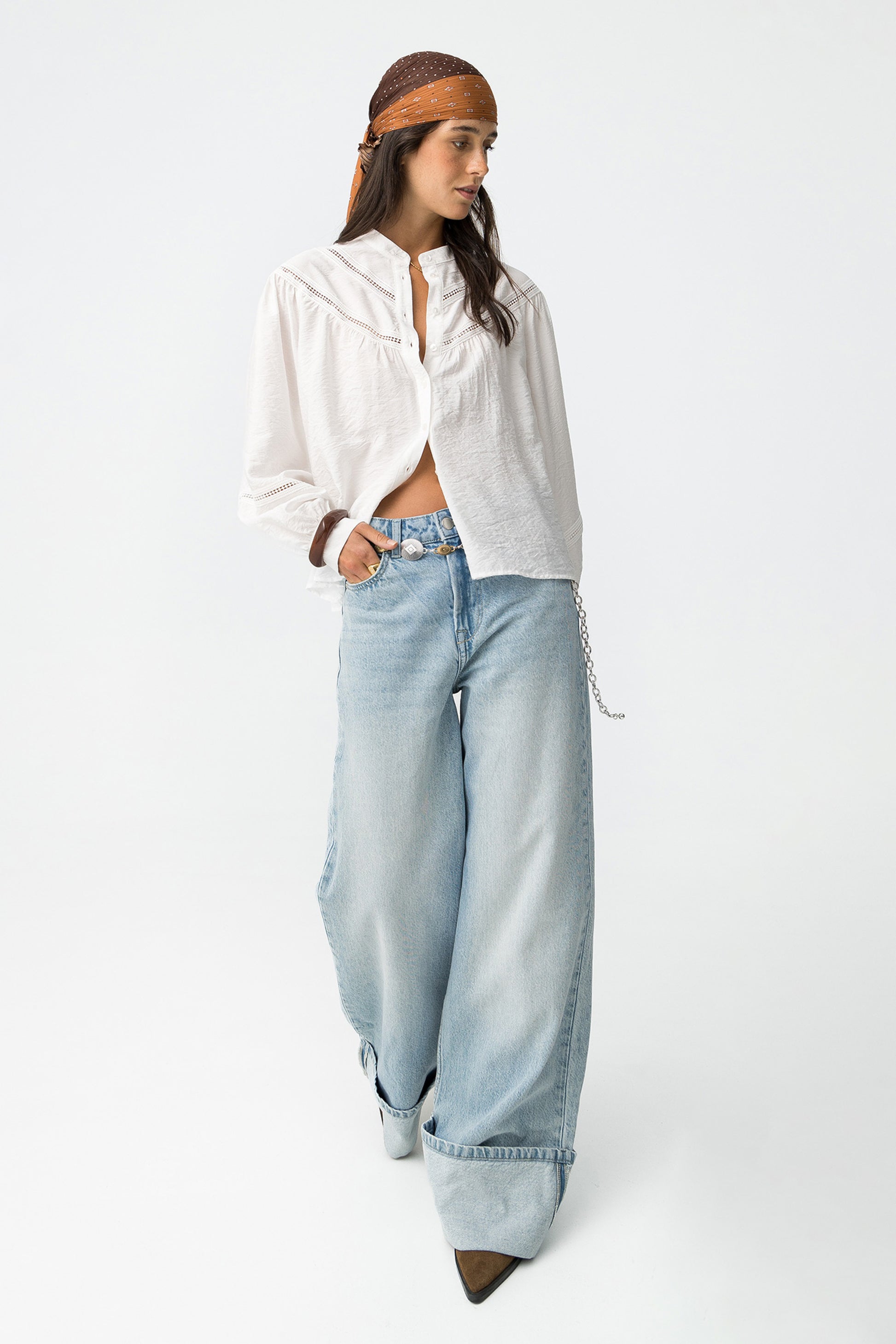 Camisa relaxed fit texturizada, con recortes de encaje y abertura frontal con cierre de botón.