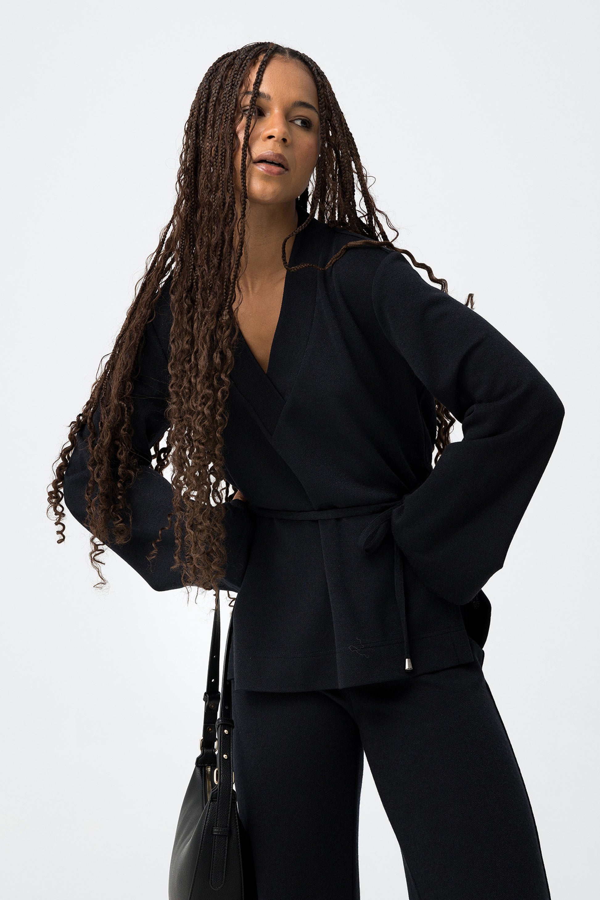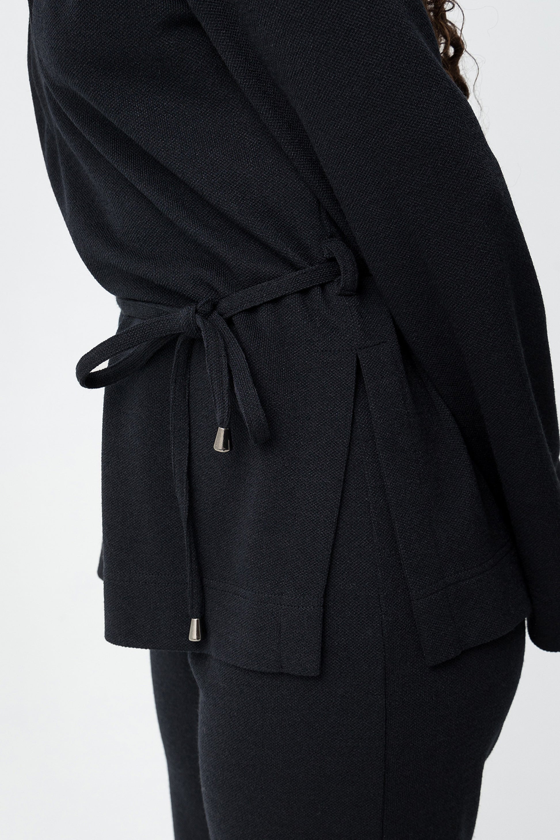 Camiseta negra de manga larga con cinturón ajustable, corte regular y mangas amplias.