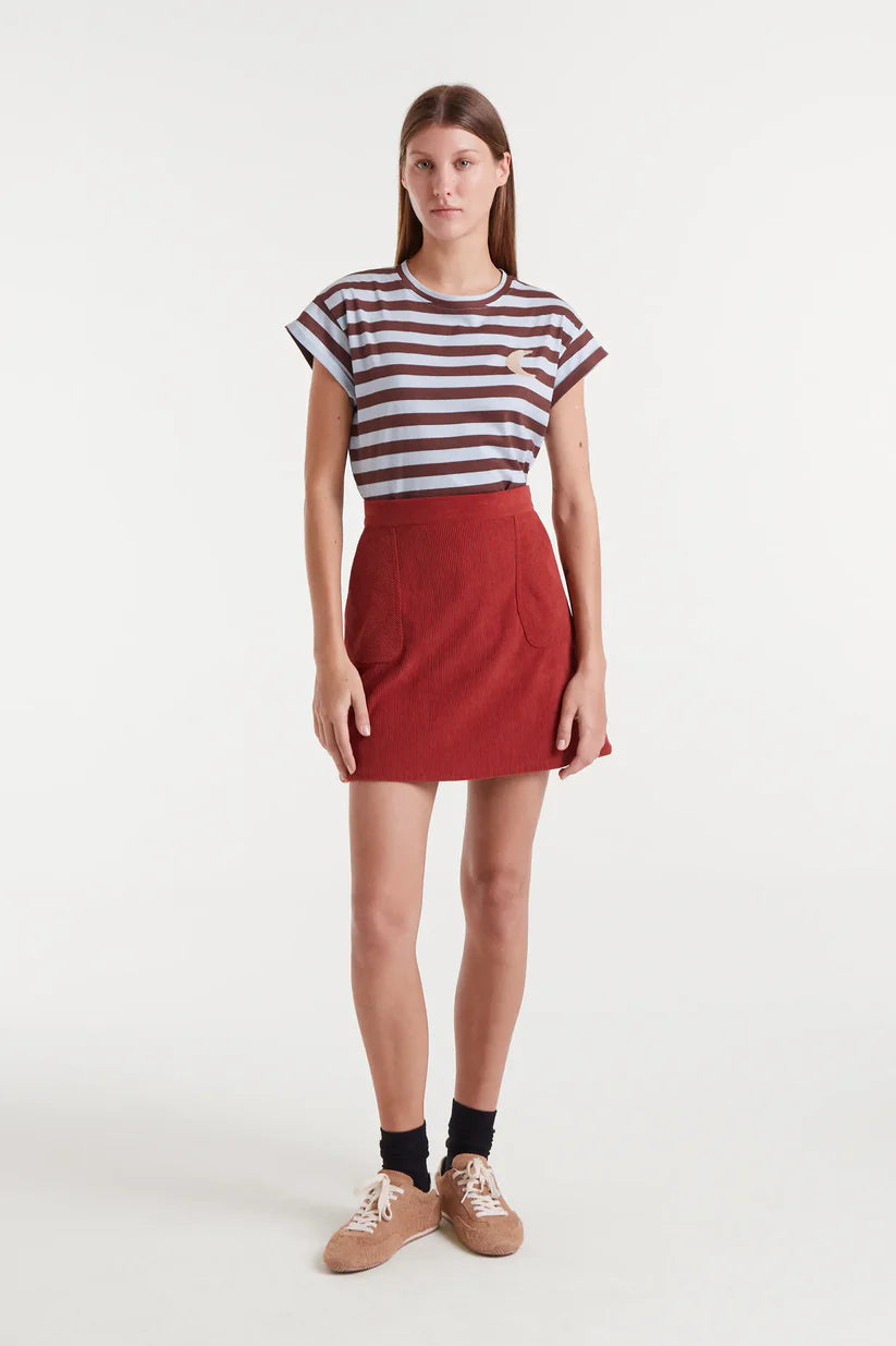 Camiseta en tejido circular con estampado de rayas de color azul y marrón con bordado de luna.