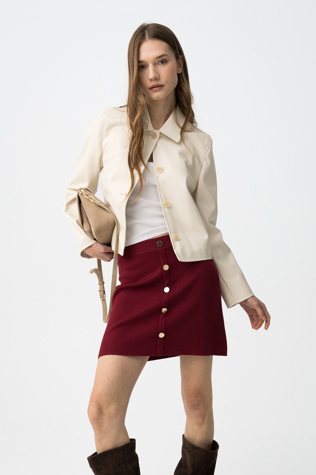 Minifalda de color rojo, corte regular, botones dorados delante y cintura alta, estilo casual chic.