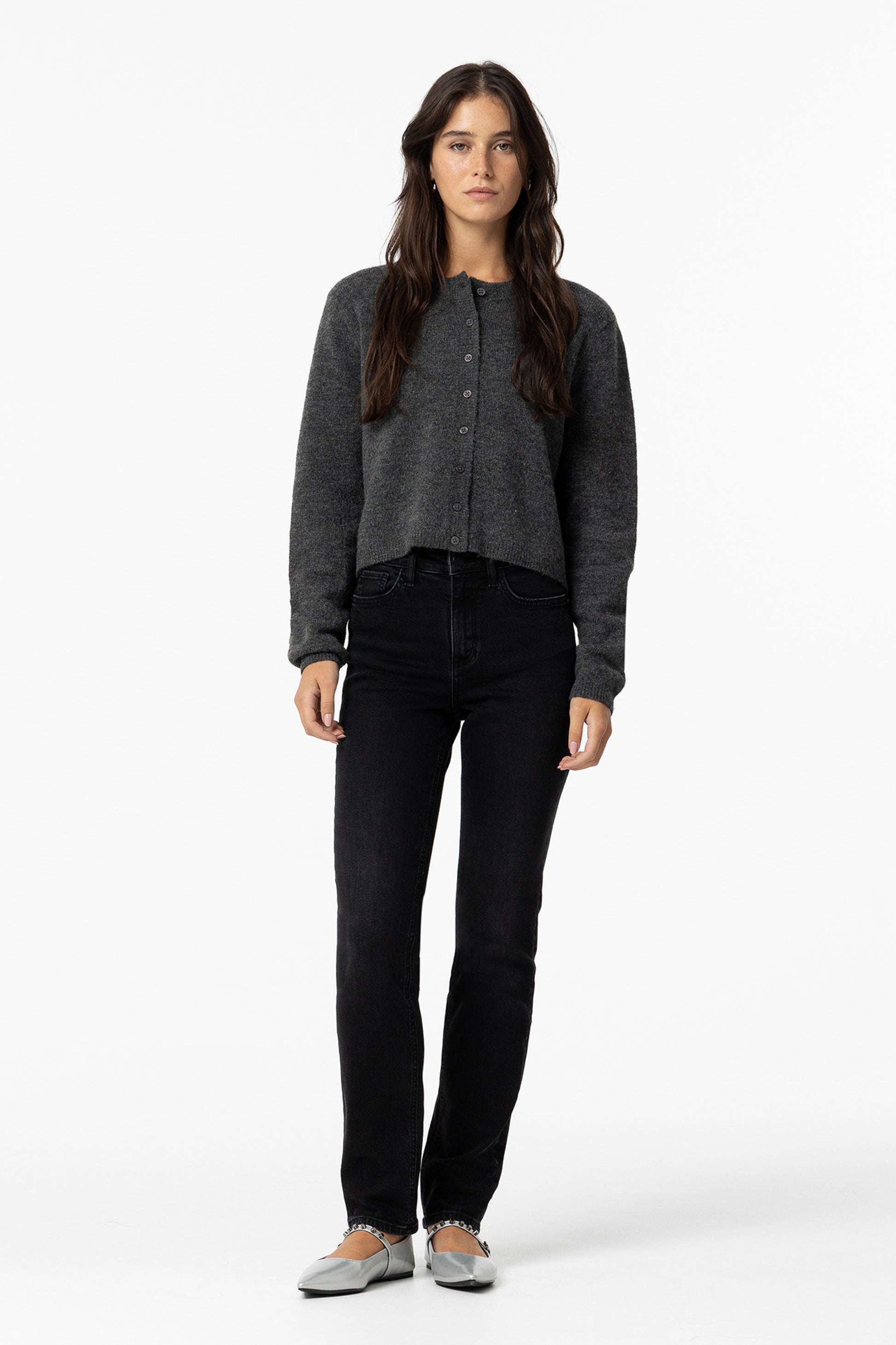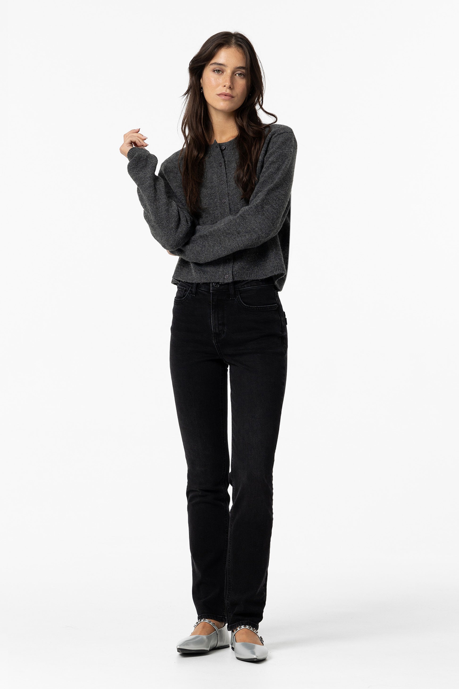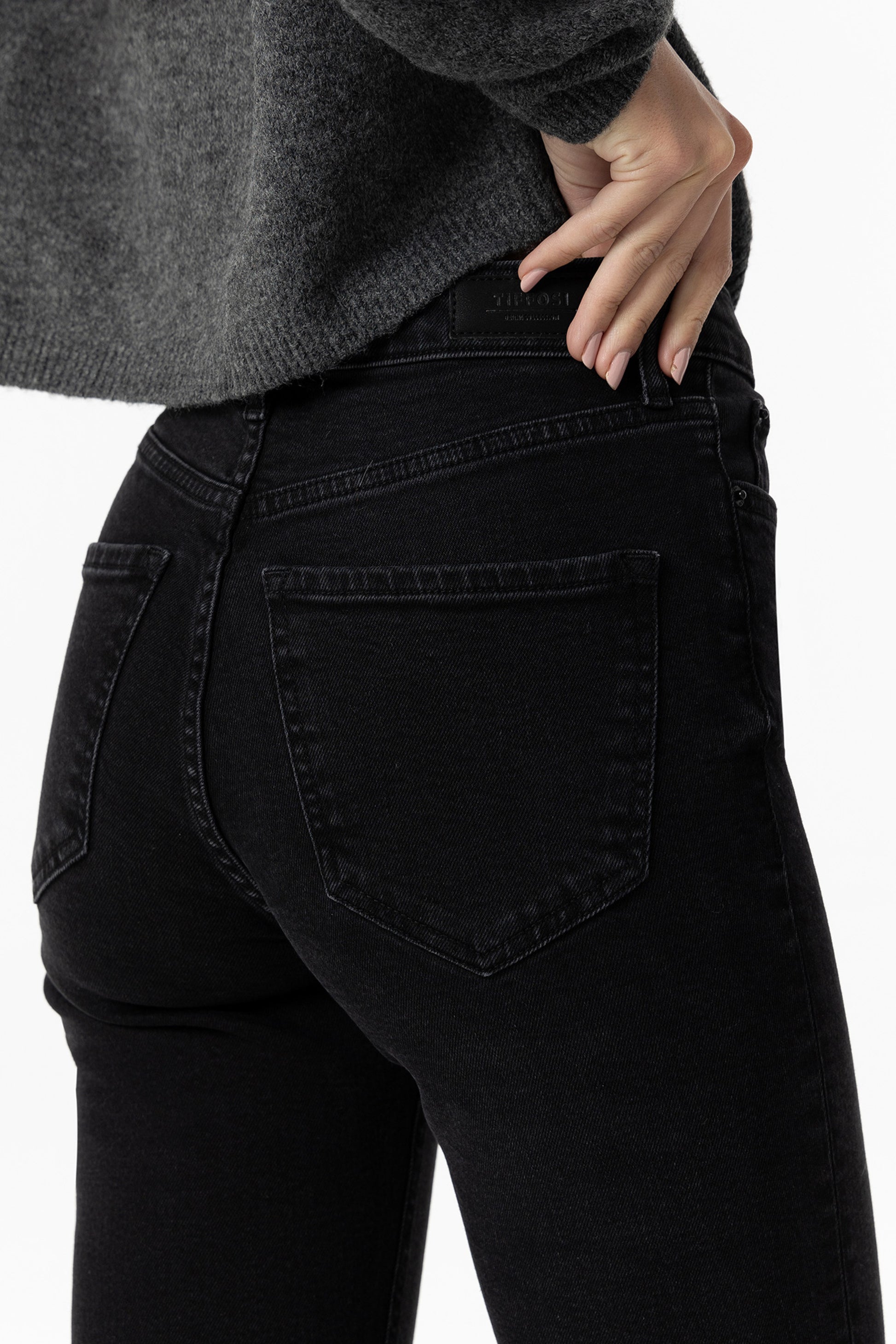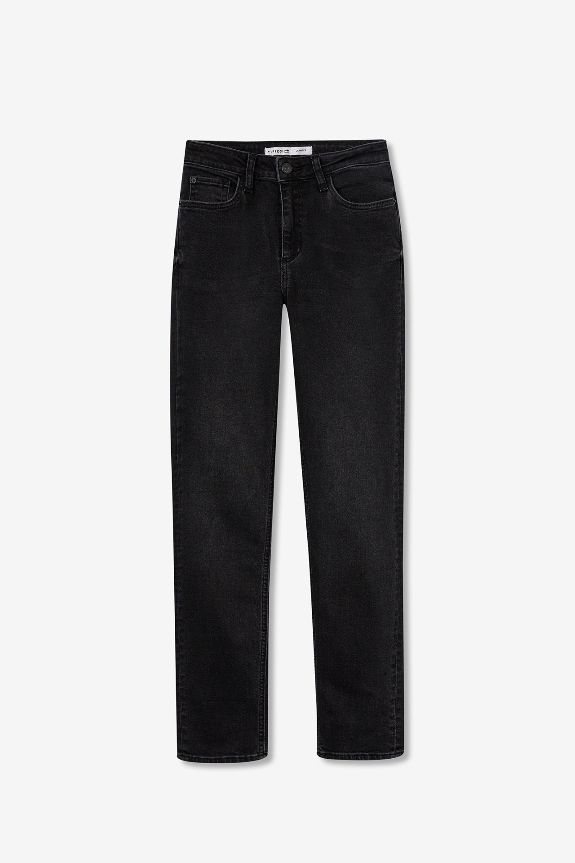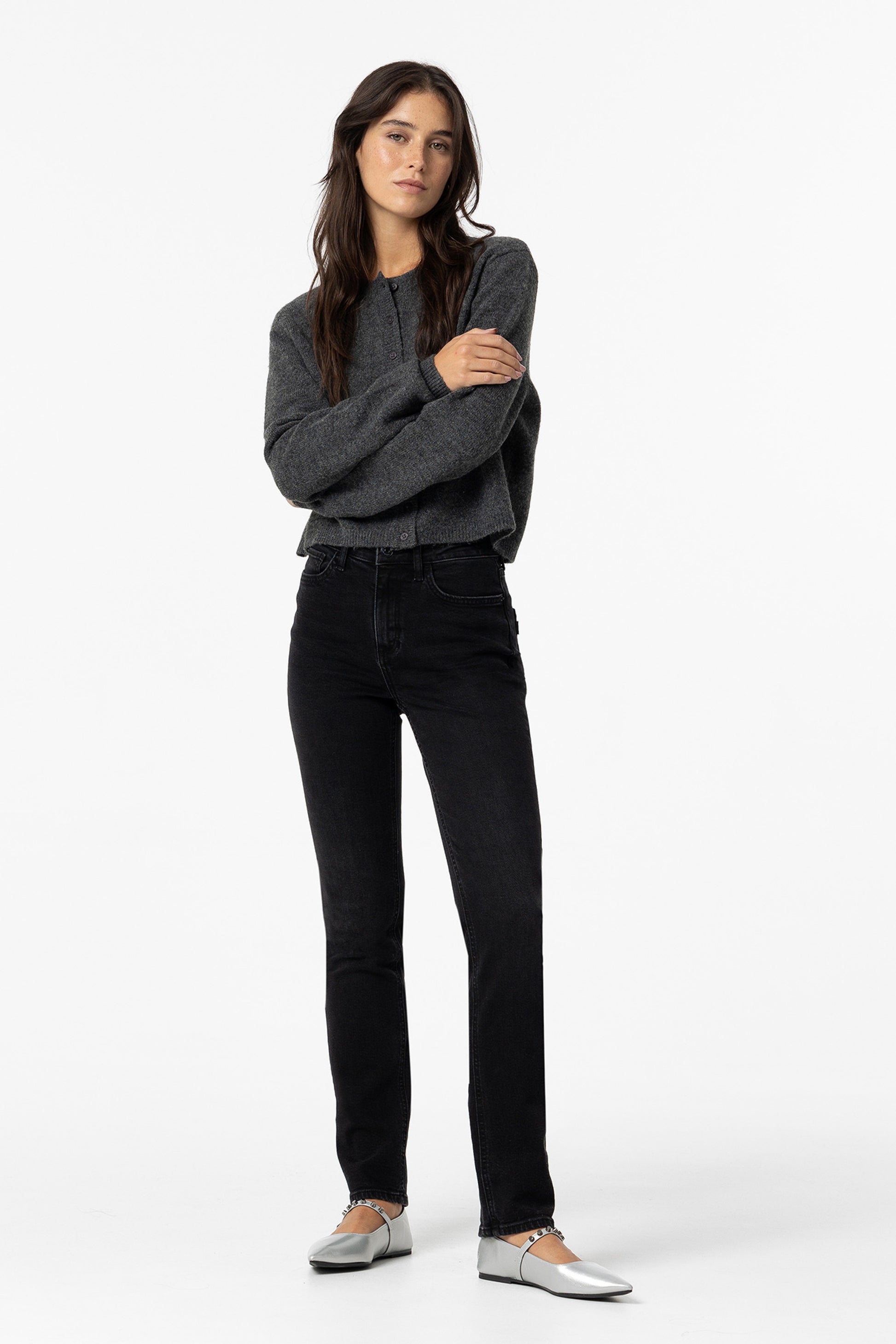 Vaqueros negros de corte slim, cintura alta y cinco bolsillos.
