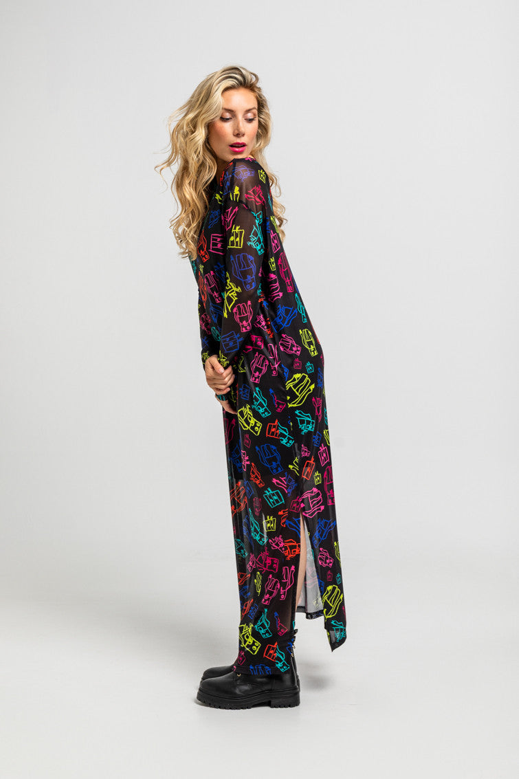 VESTIDO CAMISETA LARGO TUL DE GARABATOS DE ROBOTS MULTICOLOR LOLINA